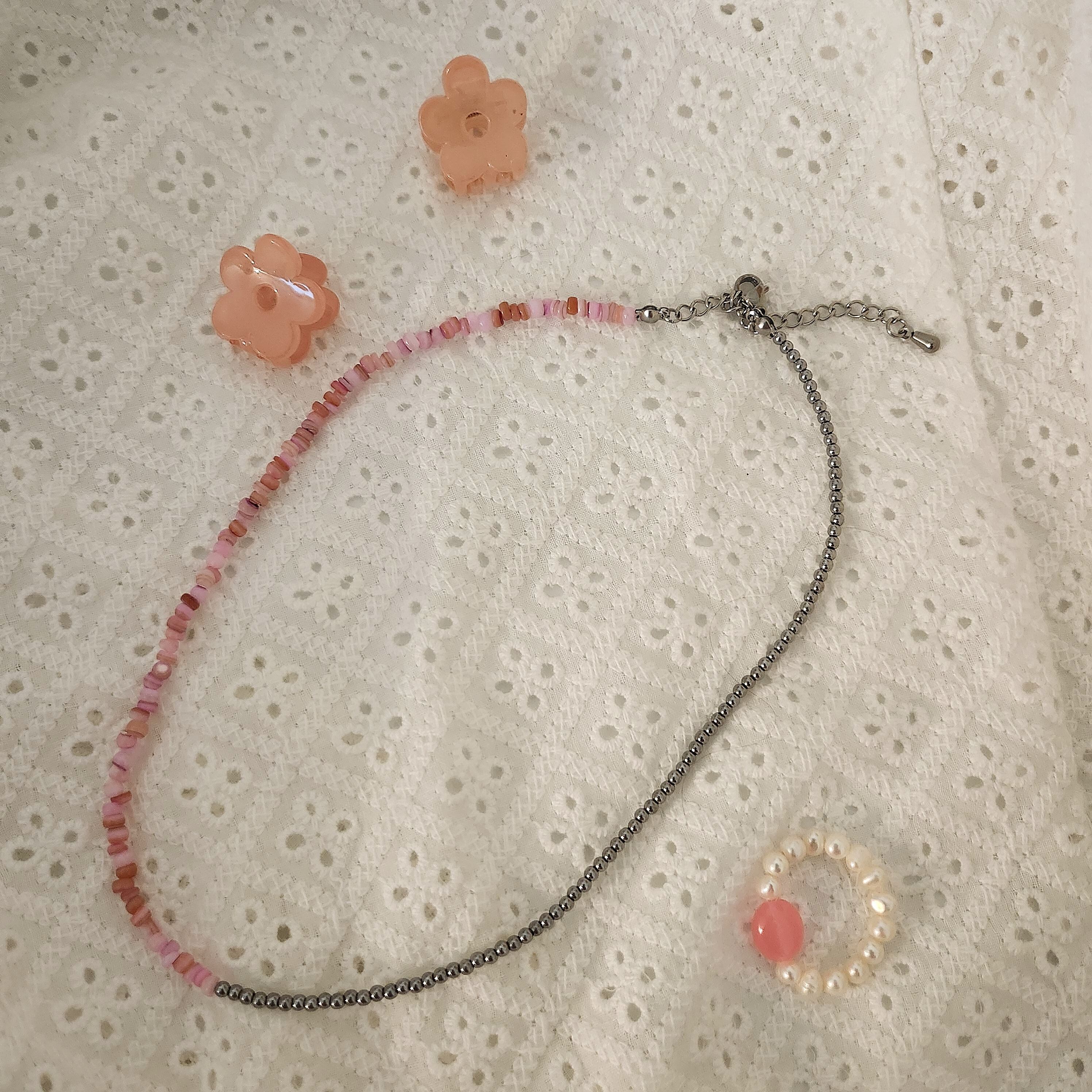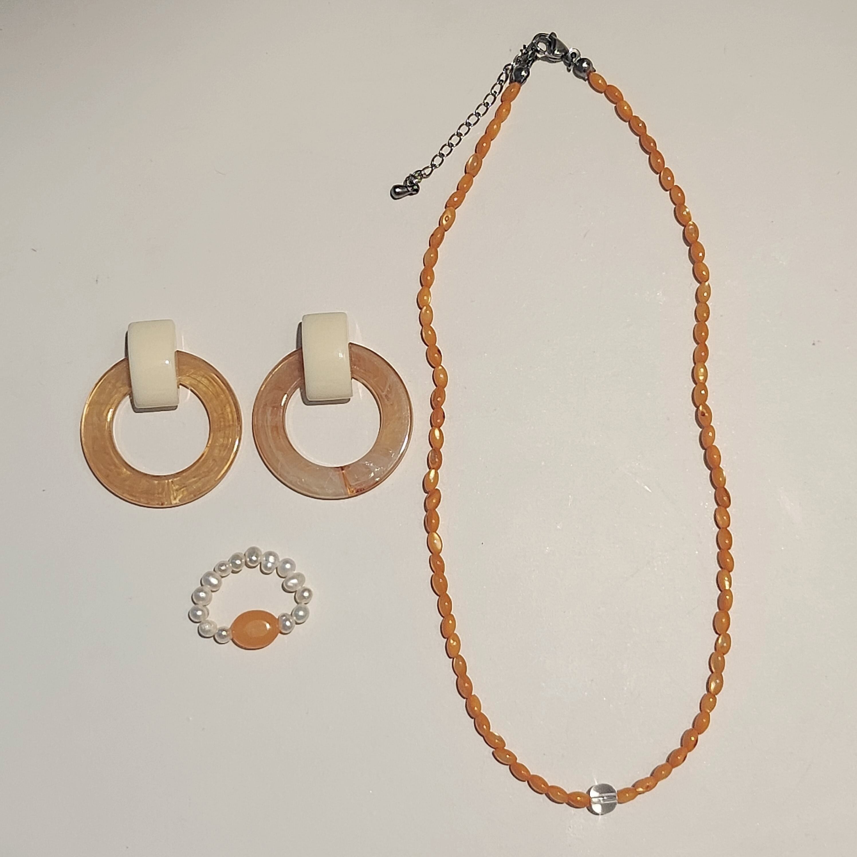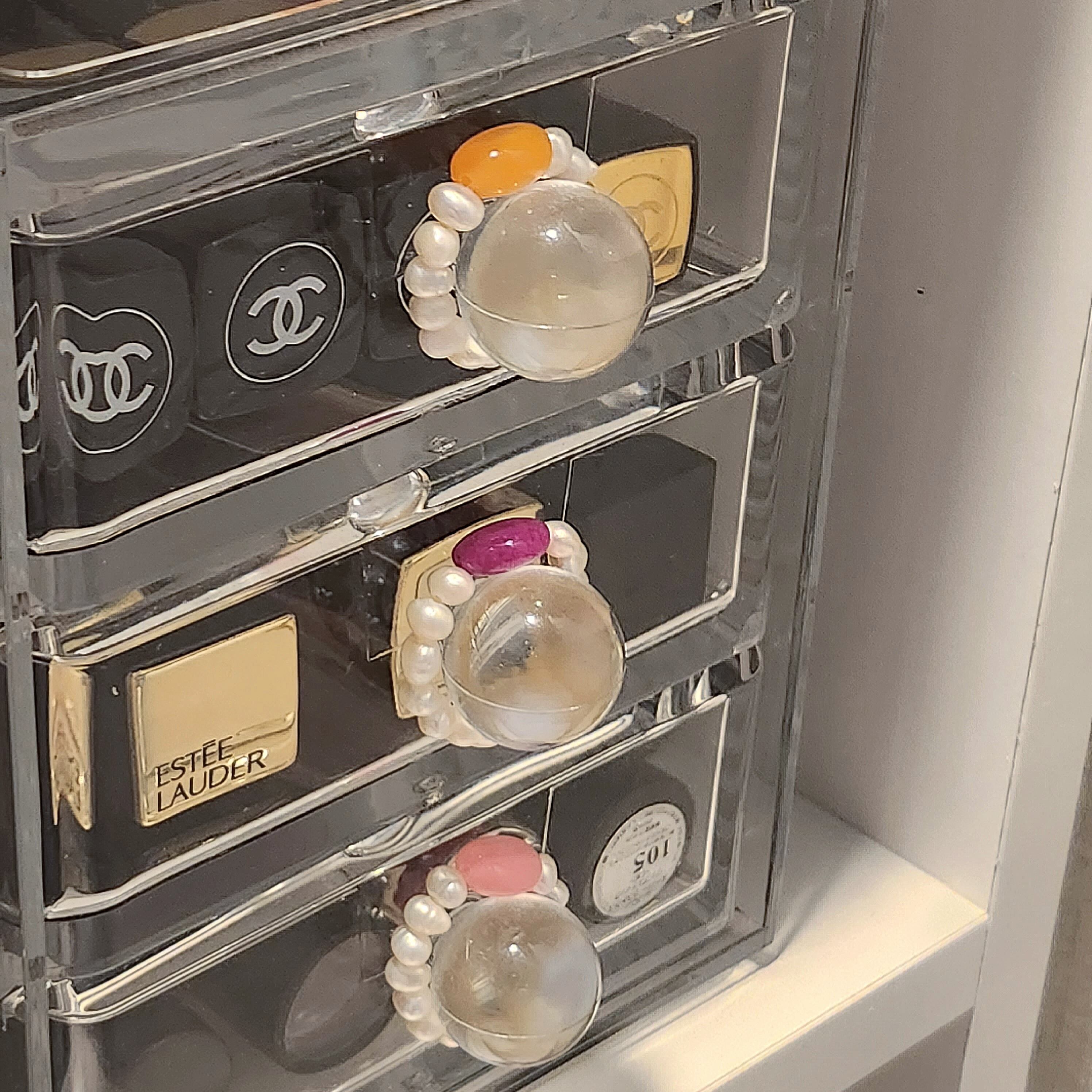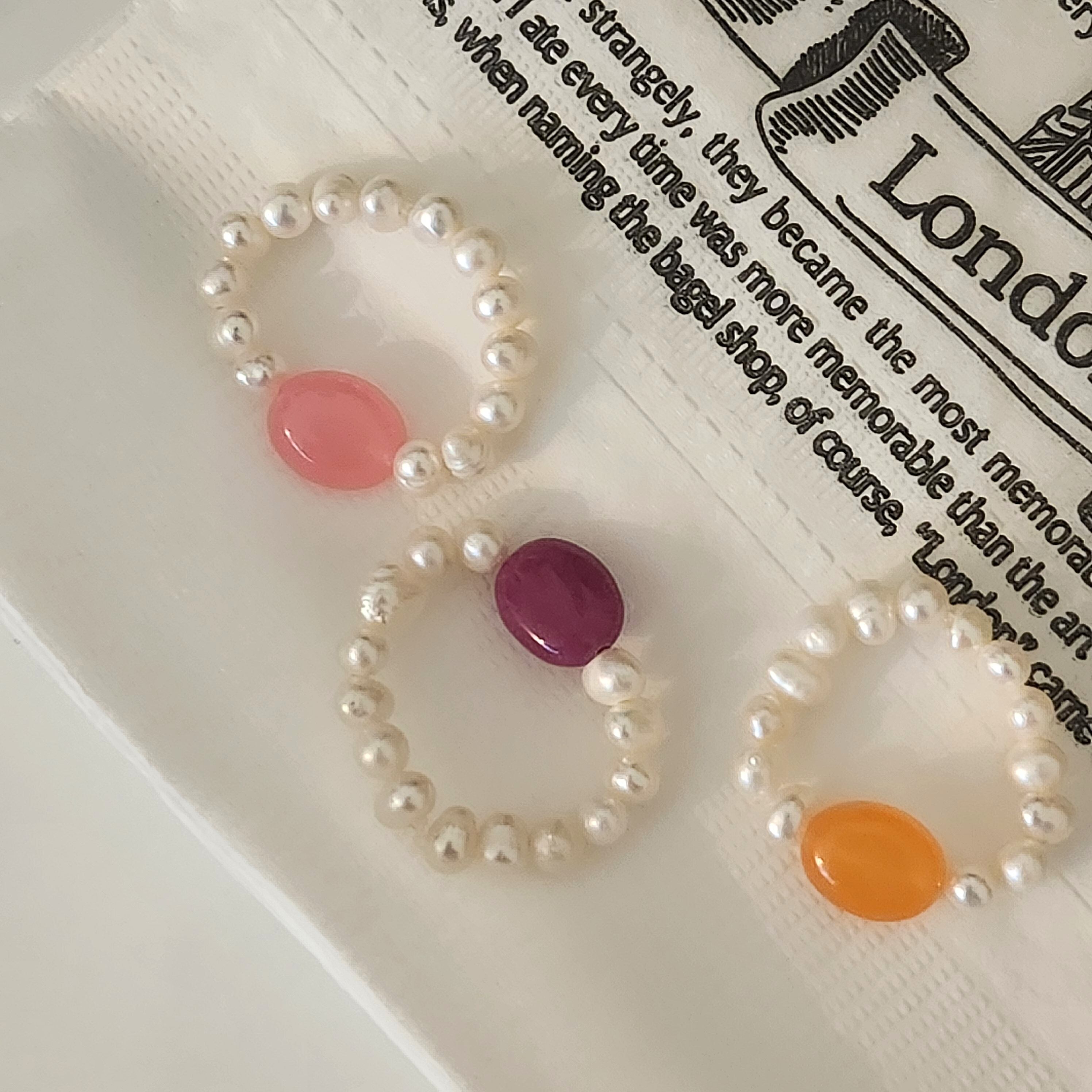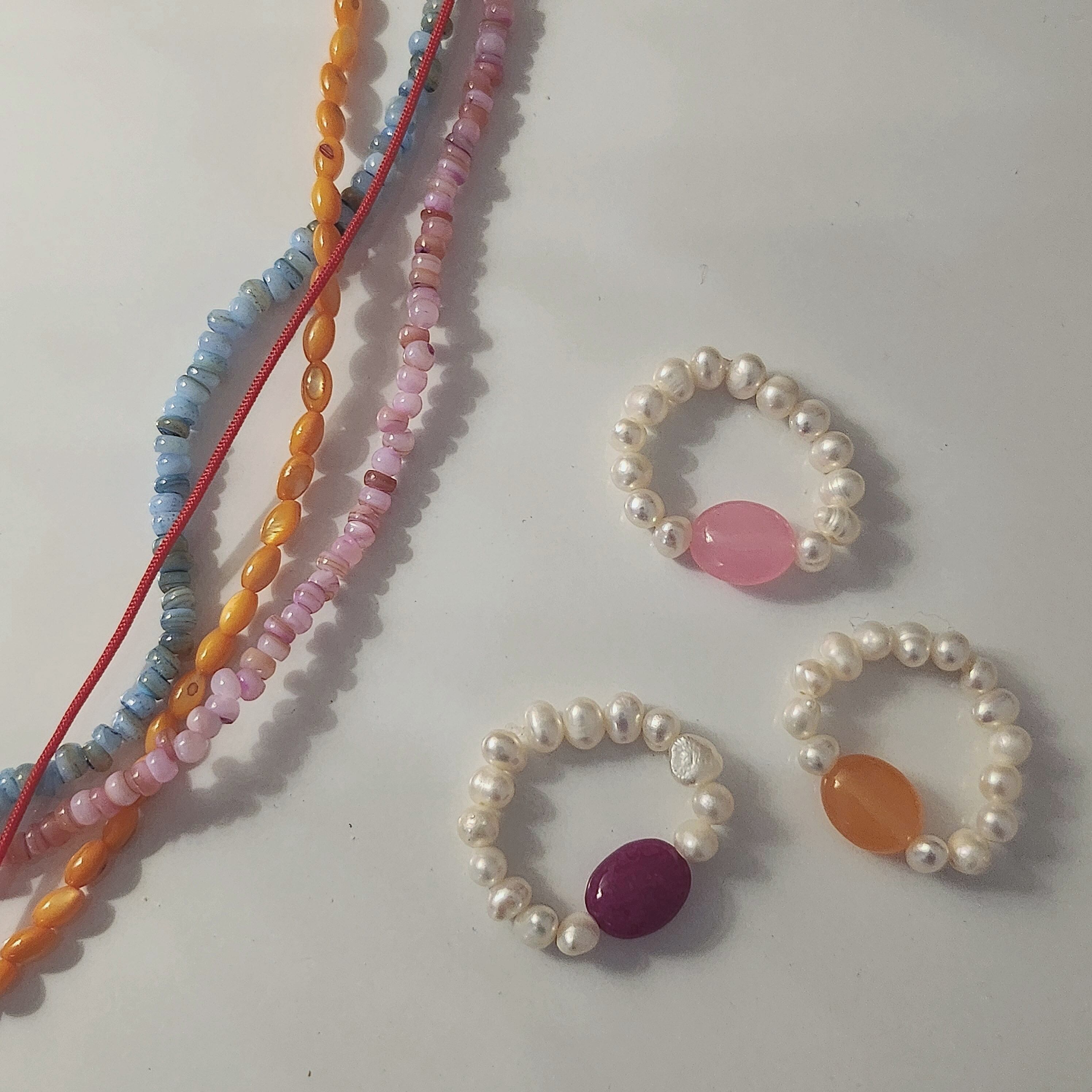 カラフルなガラスビーズとパールのペアがポップ感と遊び心を