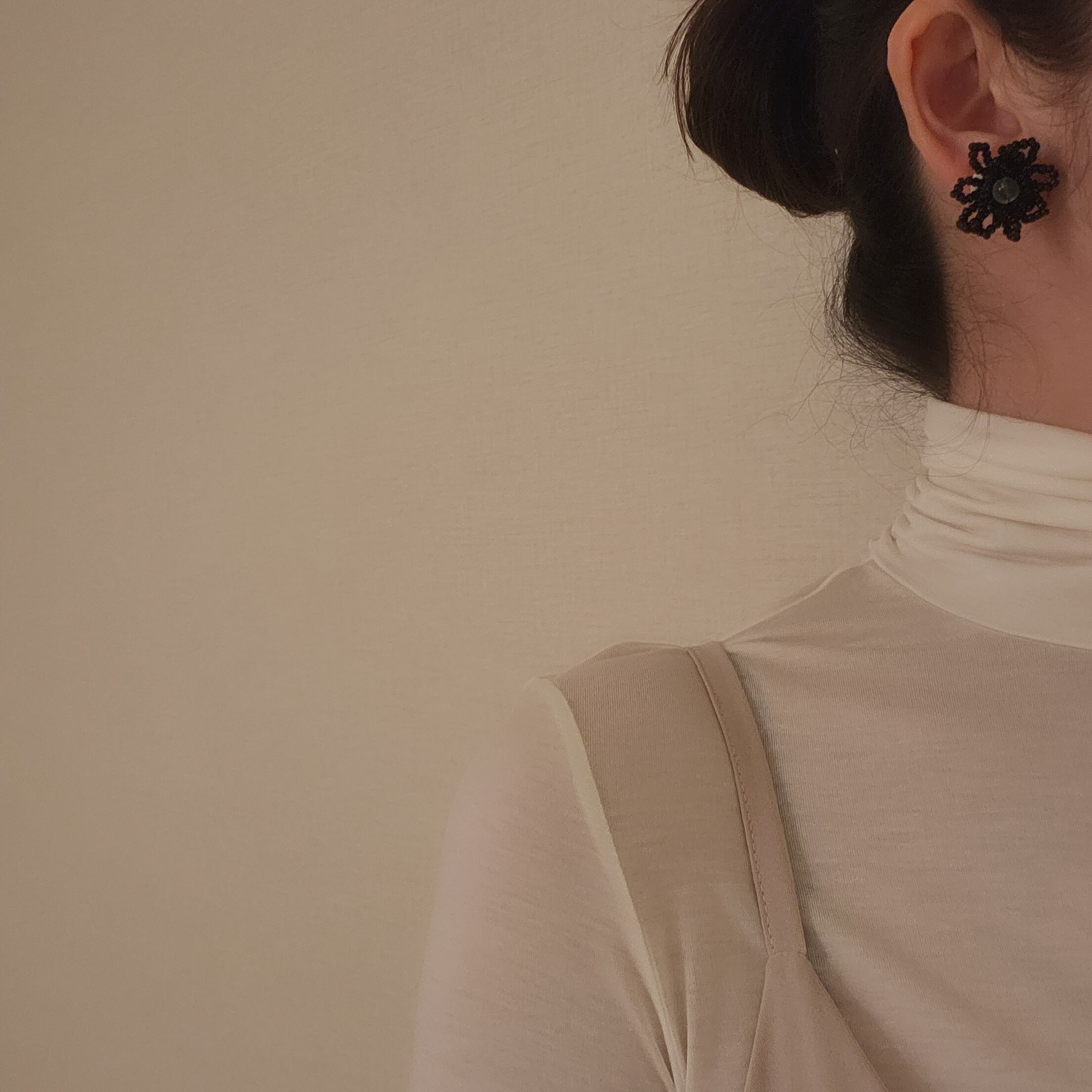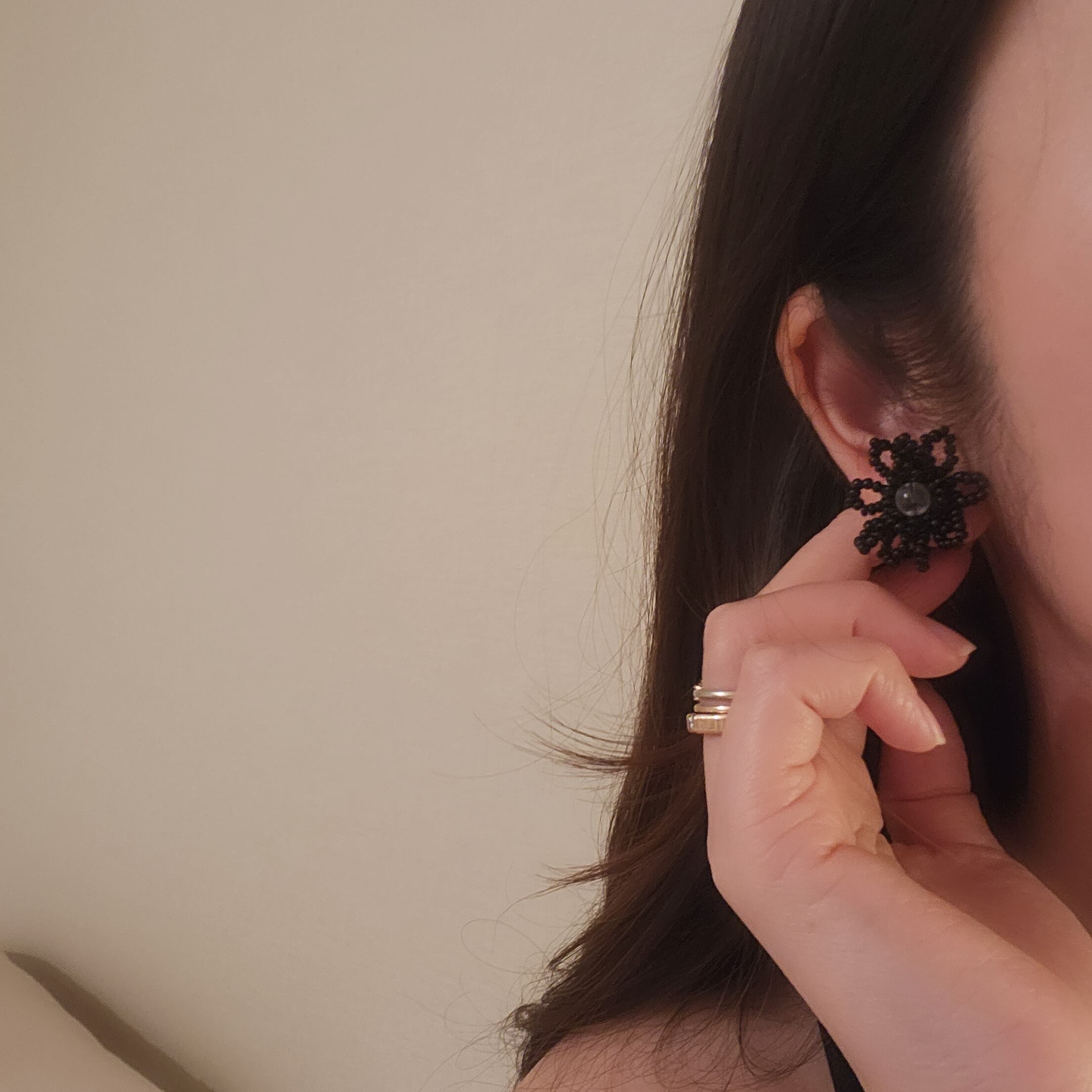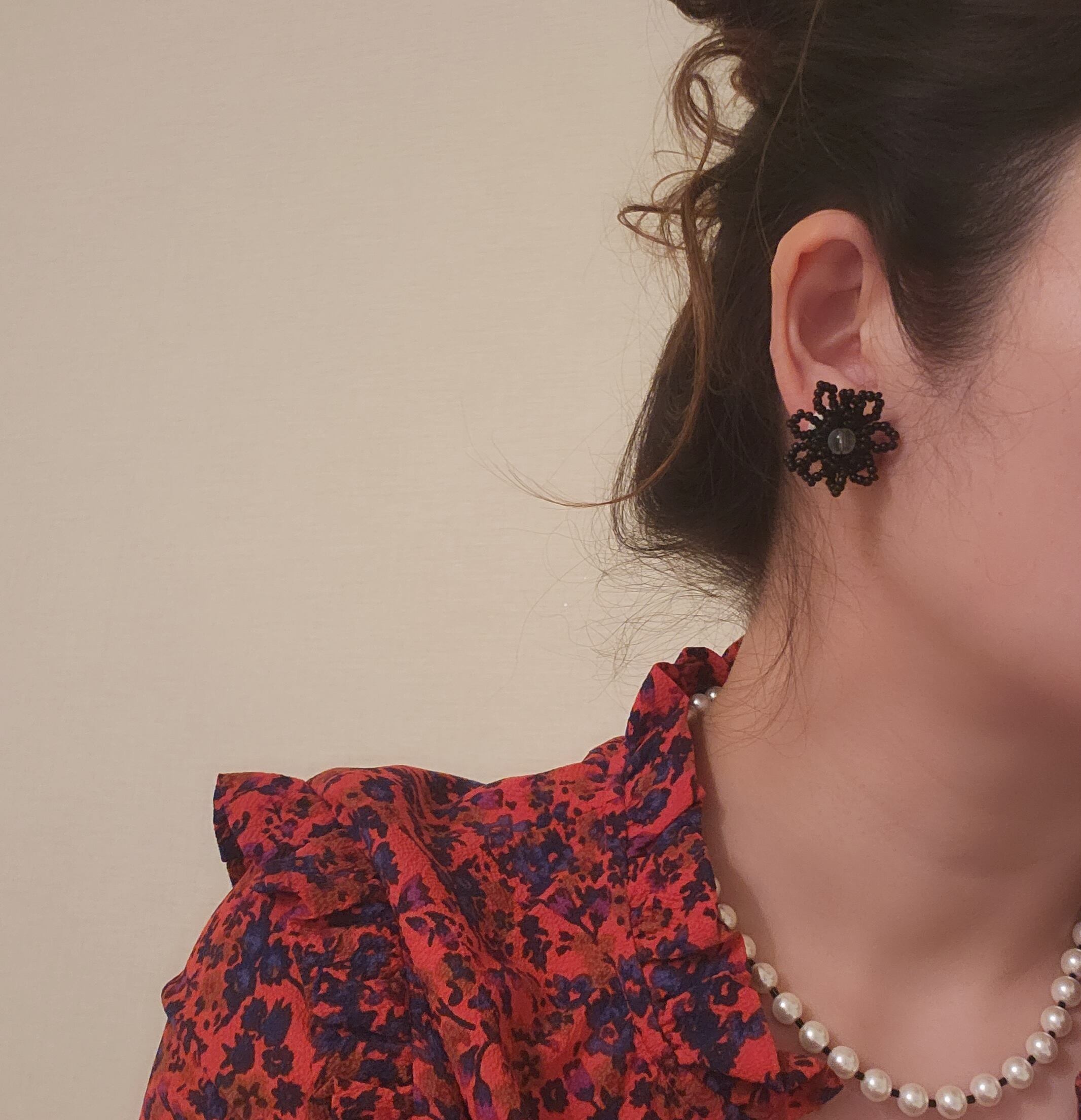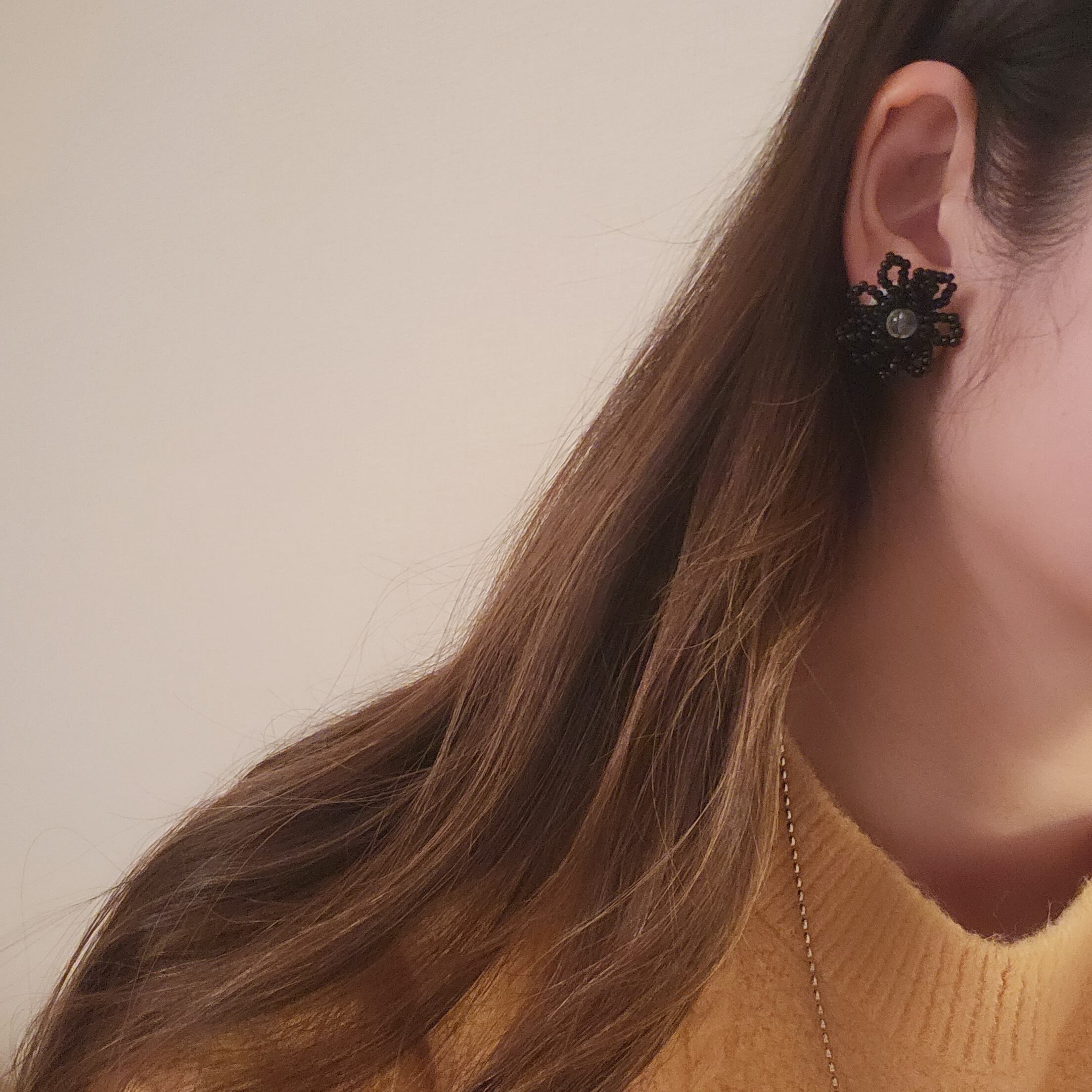シックでエレガントさを引き立てるブラックビーズで作り上げたハンドメイドのフラワーアイテム。